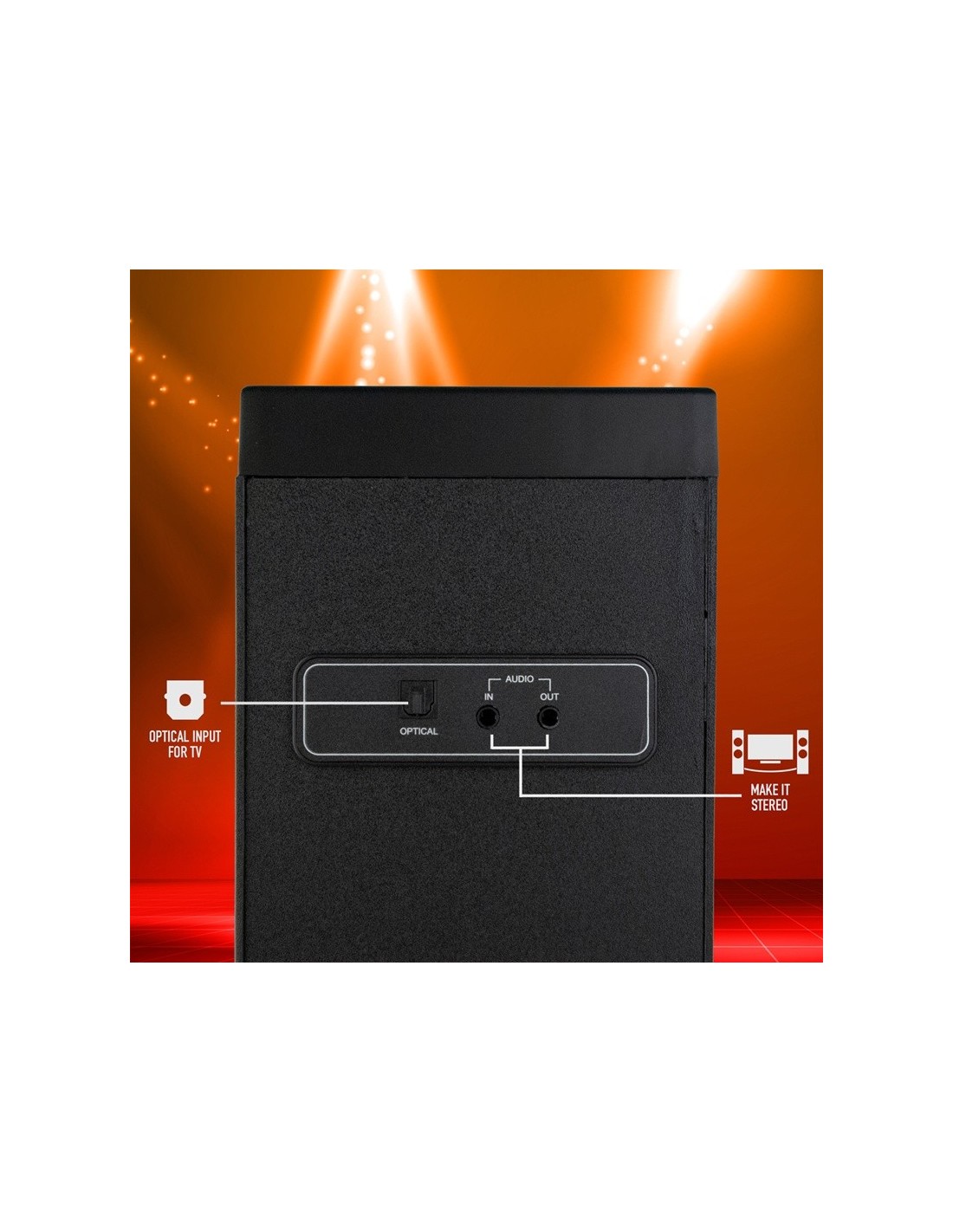 - Empareja 2 torres en estéreo gracias al cable de audio, desde la salida de audio de la torre principal a la entrada de audio de la torre secundaria. La torre secundaria solo responderá a los comandos de la torre principal.