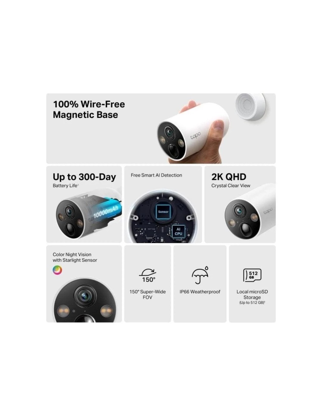 Disfruta de la potencia de una cámara IP exterior Wi-Fi que maximiza tu tranquilidad gracias a vídeo 2K QHD (2560 x 1440 px) y una óptica angular de 150°, perfecta para controlar grandes áreas en terrazas, entradas o jardines. Olvida el enchufar: su batería recargable de 10000 mAh ofrece hasta 300 días de autonomía y la puedes recargar vía USB o con panel solar (Tapo A200). La visión nocturna a color e infrarroja permite identificar caras y matrículas en la oscuridad hasta 15 m. Su resistencia IP66 garantiza fiabilidad bajo lluvia, polvo o calor. El audio bidireccional (micrófono y altavoz integrados) facilita la comunicación para avisos o disuasión en tiempo real. Gestiona la cámara desde cualquier parte gracias a la app Tapo y recibe notificaciones inmediatas cuando su IA avanzada detecta personas, vehículos o mascotas, evitando falsas alarmas y mejorando la seguridad perimetral. El almacenamiento es tan flexible como tu seguridad: graba localmente en microSD hasta 512 GB o utiliza servicios en la nube según tus preferencias. Instalarla es sencillo: el soporte magnético ajustable y su diseño compacto facilitan fijarla en pared o techo, sin complicaciones técnicas ni necesidad de cables. Además, incorpora los principales protocolos de seguridad (WPA2-PSK, AES, SSL/TLS) para proteger tus grabaciones y transmisión de vídeo.