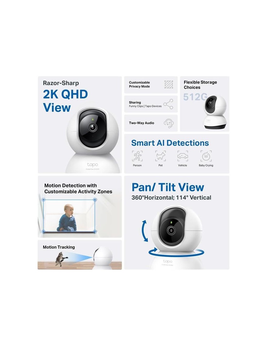 TP-Link Tapo C220. Tipo: Cámara de seguridad IP, Colocación soportada: Interior, Tecnología de conectividad: Inalámbrico. Tipo de montaje: Escritorio, Color del producto: Blanco, Negro, Factor de forma: Esférico. Ángulo de visión de la lente, horizontal: 360°. Tamaño del sensor óptico: 25,4 / 3 mm (1 / 3"). Distancia de visión nocturna: 9 m, Tipo de LED: IR, Longitud de onda infraroja: 850 nm